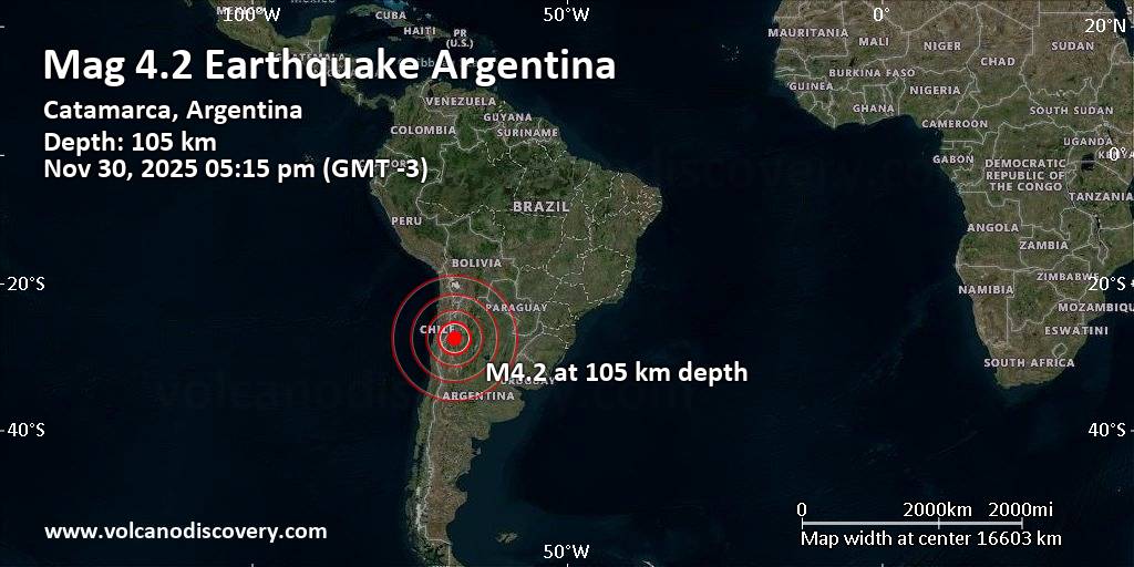 3+ hour, 17+ min ago (134+ words) Detailed info, map, data, reports, updates about this earthquake: Moderate mag. 4.2 earthquake - 28 km northwest of Tinogasta, Departamento de Tinogasta, Catamarca Province, Argentina, on Sunday, Nov 30, 2025, at 05:15 pm (GMT -3) - Look up quakes in: Mag. 4.2 earthquake - 28 km northwest of Tinogasta, Departamento de Tinogasta, Catamarca Province, Argentina, on Sunday, Nov 30, 2025, at 05:15 pm (GMT -3) - A moderate magnitude 4.2 earthquake hit 28 km (17 mi) away from Tinogasta, Catamarca Province, User-reports for this quake Data for the same earthquake as reported by different agencies Aftershocks for this quake What about this quake? Recorded aftershocks, latest first (0 quake) Average number of earthquakes - Mag. 5 or higher: 0.77 quakes per year (or 1 quake every 1.3 years) - Mag. 4 or higher: 12.5 quakes per year...