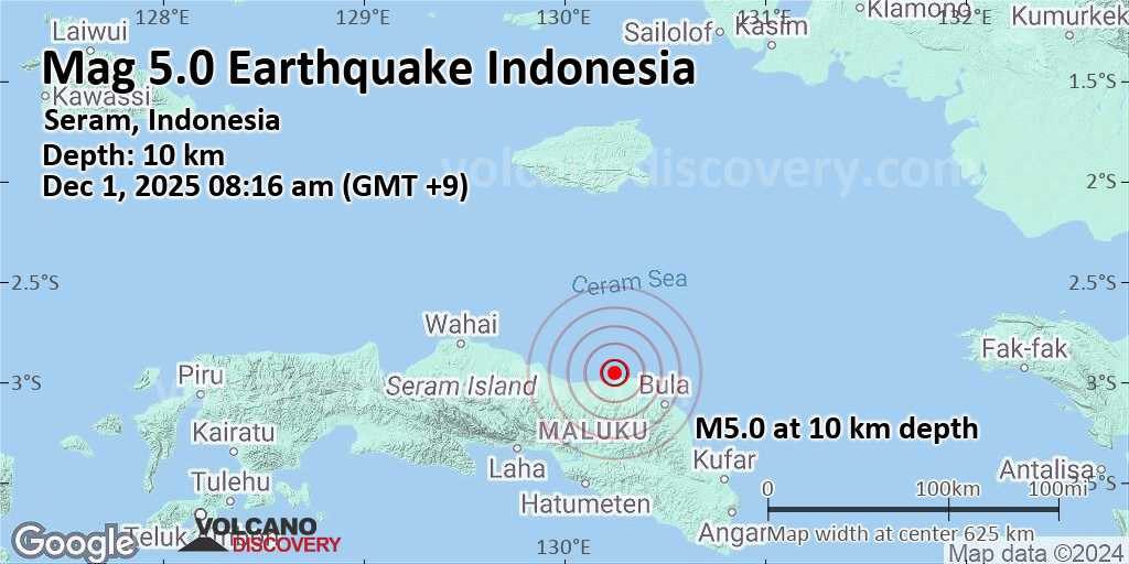 16+ min ago (127+ words) Detailed info, map, data, reports, updates about this earthquake: Moderate mag. 4.9 earthquake - Seram, Indonesia, on Sunday, Nov 30, 2025, at 11:16 pm (Universal Time) - Look up quakes in: Mag. 4.9 earthquake - Seram, Indonesia, on Sunday, Nov 30, 2025, at 11:16 pm (Universal Time) - A strong magnitude 4.9 earthquake hit Seram, Indonesia, on Sun, Nov 30, 2025 at 23:16 GMT. The depth of the quake could not be determined, but is assumed to be shallow.The quake was not felt (or at least not reported so). User-reports for this quake Data for the same earthquake as reported by different agencies Aftershocks for this quake What about this quake? Recorded aftershocks, latest first (0 quake) Previous quakes in the same area of this earthquake...